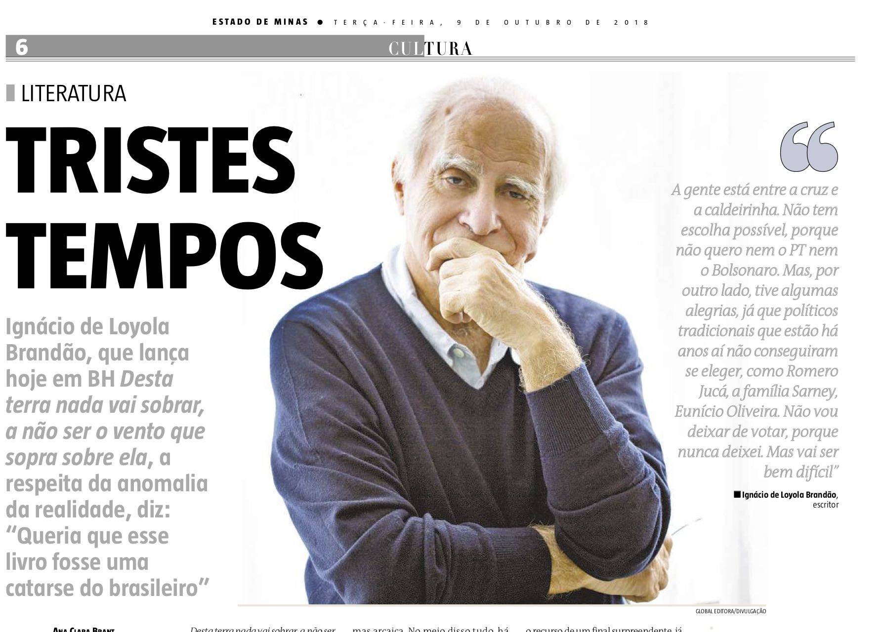 O projeto “Sempre um Papo” tem a honra de receber Ignácio de Loyola Brandão o para o debate o lançamento do esperado livro “Desta terra nada vai sobrar, a não ser o vento que sopra sobre ela” (Global Editora). Com entrada franca, será no dia 09 de outubro, terça-feira, 19h30, no auditório da Cemig. Loyola é considerado um dos mais completos escritores da sua geração. É romancista, jornalista, contista, cronista, biógrafo, escritor de livros infanto-juvenis e não-ficção.