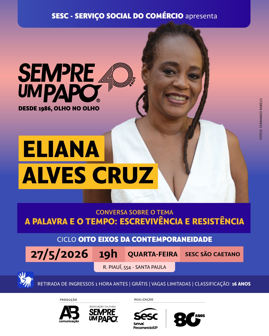 O Sesc São Caetano recebe, no dia 27 de maio, às 19h, a escritora Eliana Alves Cruz para um encontro do eixo A palavra e o tempo: escrevivência e resistência, que integra o ciclo “Oito Eixos da Contemporaneidade”. A atividade faz parte da programação que celebra os 80 anos do Sesc São Paulo e os 40 anos do Sempre Um Papo.